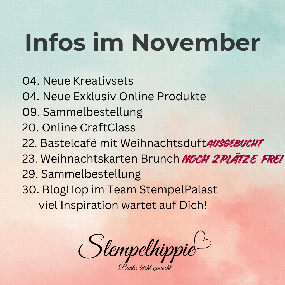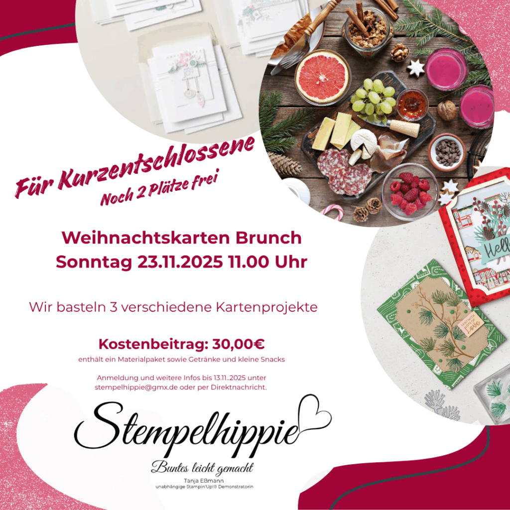 Ich liebe es kreativ mit Papier zu sein und liebe es Gleichgesinnten zu zeigen welche tollen Projekte sich mit Stampin‘ Up! Produkten gestalten lassen. Hierzu veranstalte ich bei am 23.11.2025 einen Kartenbrunch. In gemütlicher Atmosphäre gestalten wir weihnachtliche Karten. Wir werden stempeln, kleben und schnibbeln, quatschen und naschen.